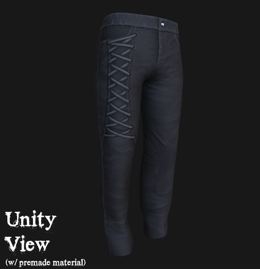This item comes with a pre-made material for use in Unity (for Poiyomi 8), already set up and optimized for better performance. Textures are included with pre-set settings in material's Unity package for better optimization. Simply import the package and drag the material onto the pants and everything should be set up for you! (Material created using Poiyomi Pro 8.1.138, compatible with Poiyomi Free 8.0.426)